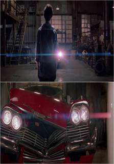 La deuxième partie, qui se déroule sous un rythme bien plus soutenu, nous dévoile le côté horrifique du film. Sous l’influence de la voiture va naître une relation toxique, une dépendance et un changement radical chez l’adolescent. L’amour excessif qu’il éprouve pour Christine va le rendre violent, inconscient, fou et cela aussi bien auprès de sa famille, de ses amis. Avant d’être un film d’horreur qui a pour but de divertir, Christine est une mise en garde pour le spectateur. La grande originalité de ce film réside dans cette voiture qui, malgré sa forme, présente toutes les caractéristiques d’une véritable femme fatale (sa couleur rouge vif, le fait qu’elle aime se faire désirer, la jalousie qu’elle éprouve lorsque Arnie la délaisse pour une autre etc). La scène de la “révélation” entre Christine et Arnie propose une mise en scène très intéressante. La musique sensuelle et les plans rapprochés sur certaines parties du “corps” de la voiture suggèrent le caractère sexuel de la scène qui nous fait penser à un strip tease de la voiture. Elle se dévoile à Arnie et dévoile au spectateur qu’il n’y a plus aucun doute sur la nature de leur relation.